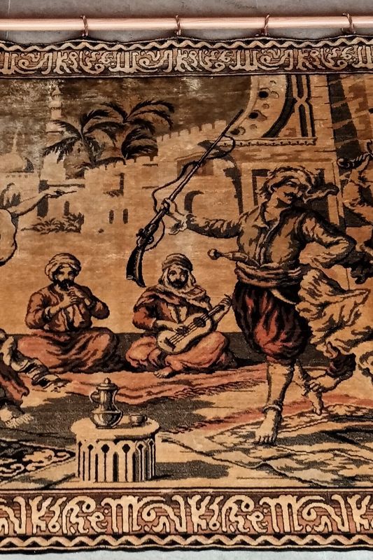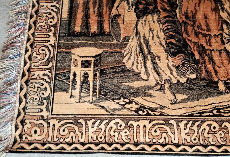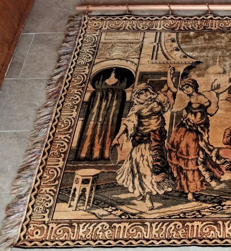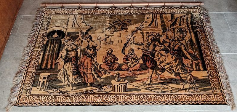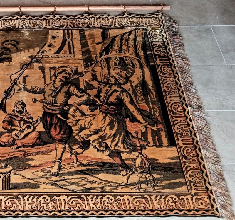 Antiker Wandteppich - Gobelin - mit Schlaufen + Stange zum Aufhängen ... orientalische Tanzszene ... Breite mit Fransen ca. 200 cm, Höhe ca. 125 cm ... sehr gute Erhaltung... Familiennachlass (nach Angaben von Kriegsheimkehrer mitgebracht)