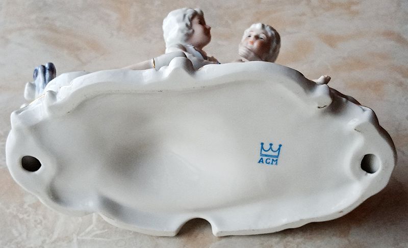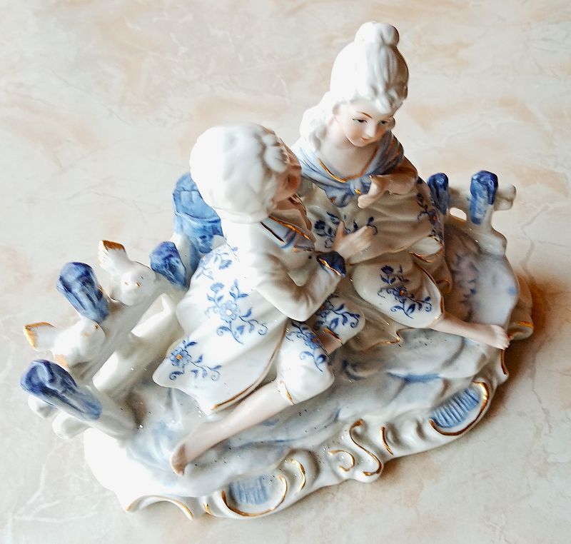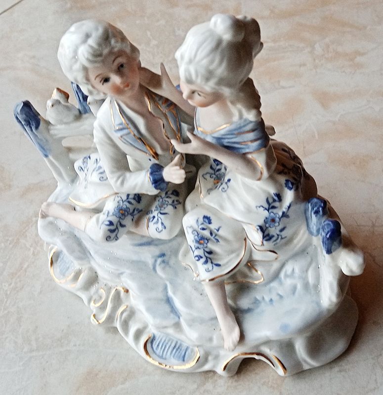Antike Porzellanfigur ... sitzendes Liebespaar ... blau verzierte und goldumrandete Kleidung sowie weitere dekorative Details ... Breite Sockel unten ca. 19 cm, Höhe ca. 14 cm ... sehr gute Erhaltung