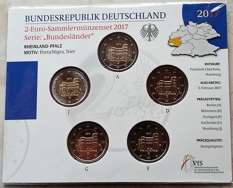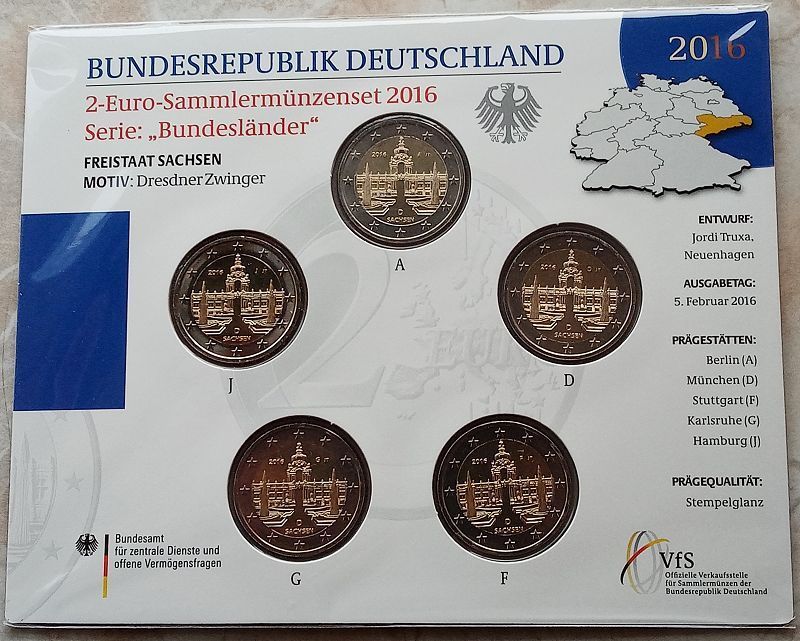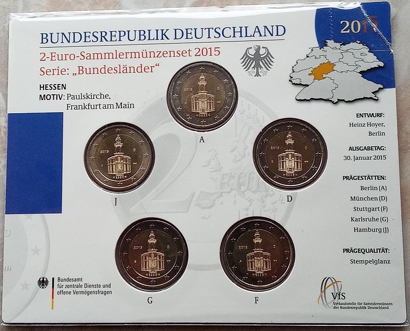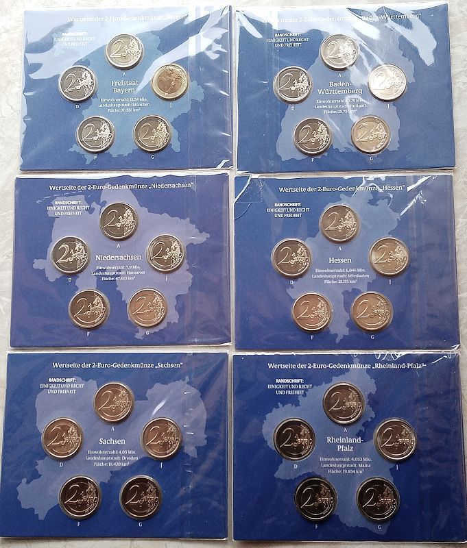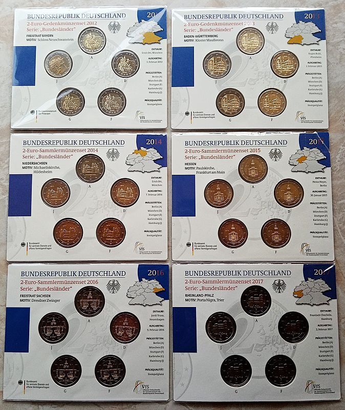 6x 2 Euro Gedenkmünzenset ... Serie Bundesländer ... aus 2012 bis 2017 ... je 5x 2 Euromünzen der Prägestätten A, D, F, G, J ... in Original-Blistern ... Set 2015 rechte obere Ecke leicht beschädigt