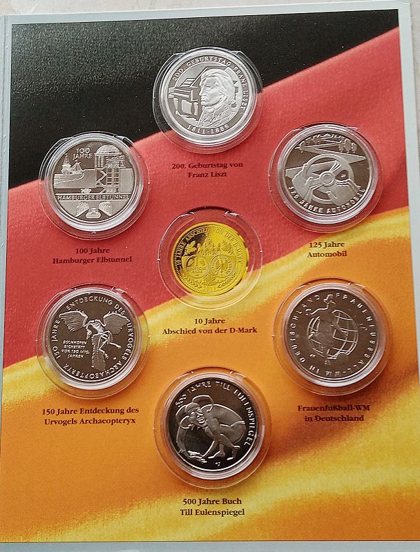 | ME79 | Medaillen | Farbmünzen ... 10 diverse Farb-Gedenkprägungen ... verkapselt mit 6 Zertifikaten ... u. a. Obama, Benedict, Helmut Schmidt, Sigmund Jähn, Olympics Athen 2004 |