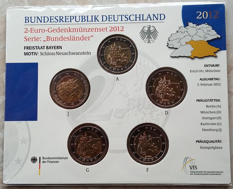 | M292 | B R D | 6x 2 Euro Gedenkmünzenset ... Serie Bundesländer ... aus 2012 bis 2017 ... je 5x 2 Euromünzen der Prägestätten A, D, F, G, J ... in Original-Blistern ... Set 2015 rechte obere Ecke leicht beschädigt | 99,00 |
